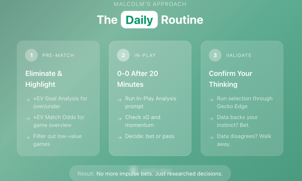Gecko Edge Team: The word “eliminate” is important here. Finding value isn’t just about identifying what to bet — it’s about knowing what to avoid. Malcolm’s daily routine uses Gecko Edge to filter out the noise and focus only on matches where the data supports a position. That discipline is what separates consistent bettors from the rest.