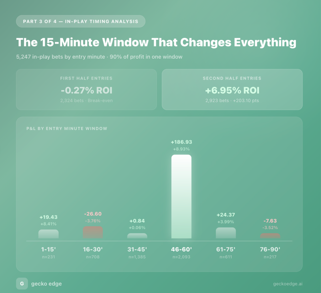 The 1-15′ window shows a decent ROI (+8.41%) but from only 231 bets — too small to draw firm conclusions. The 16-30′ window actively loses money. The 31-45′ window is dead flat. Then 46-60′ explodes.
