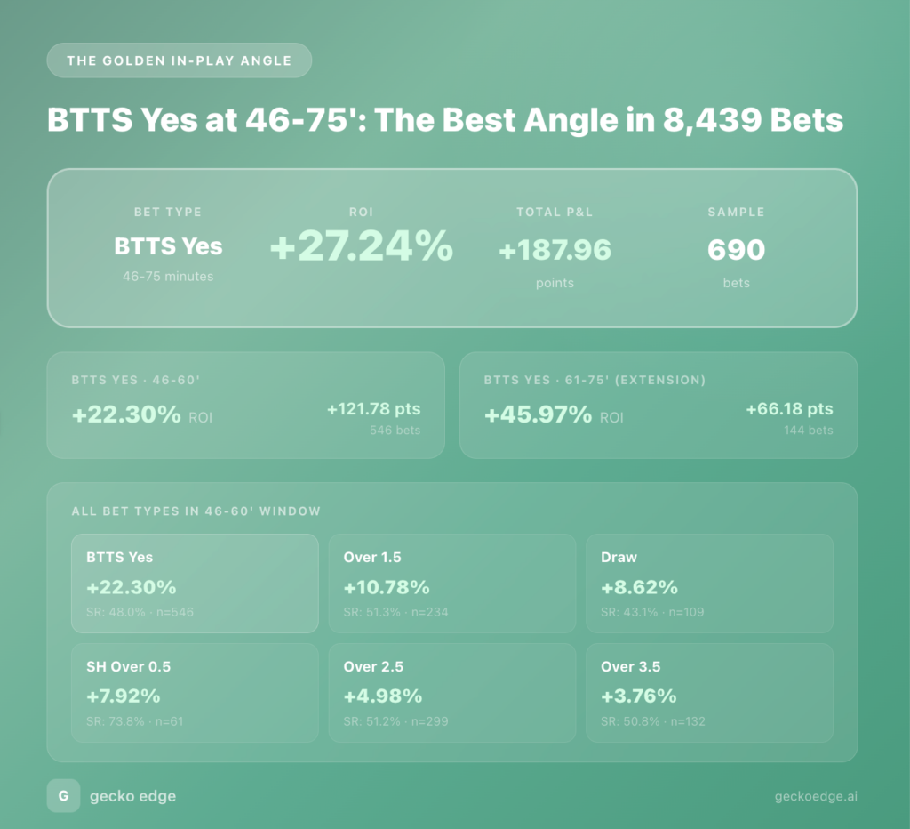 - BTTS Yes at 46-75′ is the golden angle (+27.24% ROI, 690 bets)