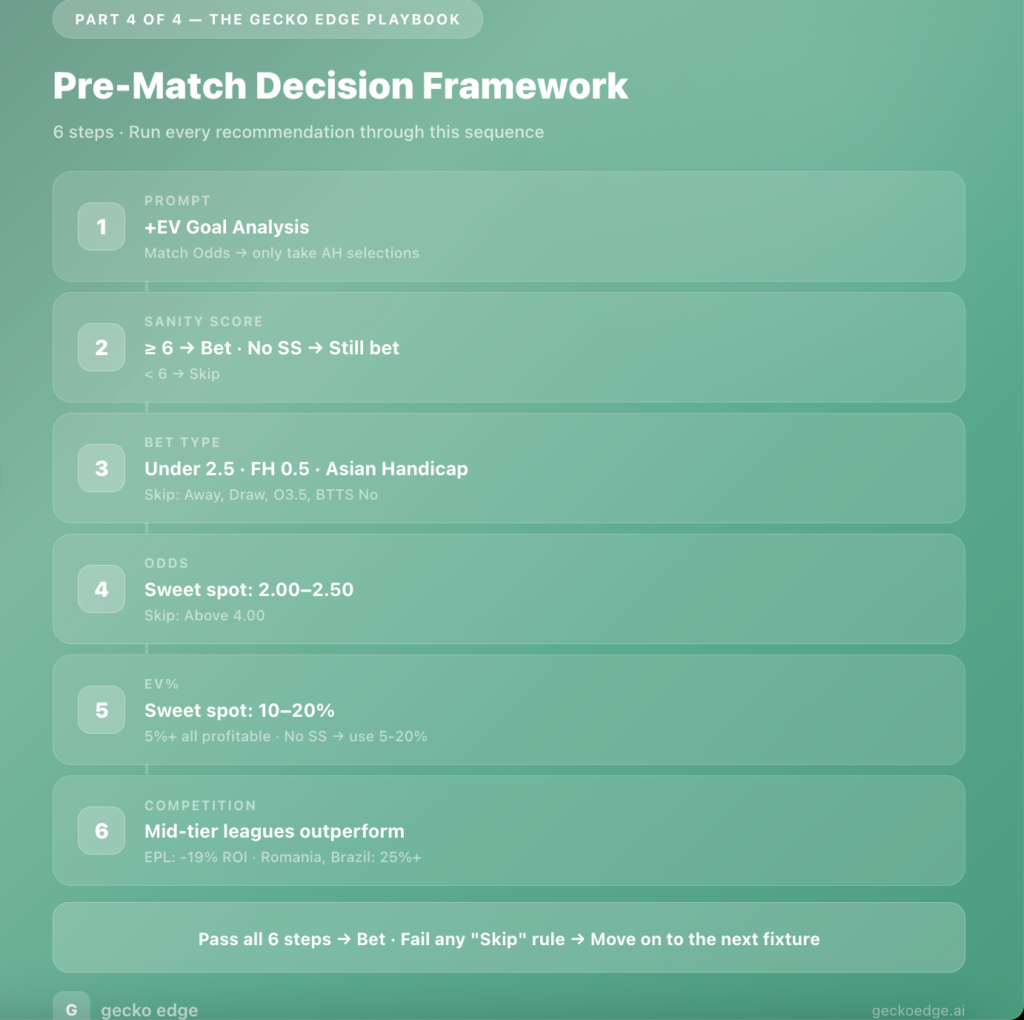 5. Everything else → Bet. Prioritise Under 2.5, FH 0.5, and Asian Handicap. Weight by EV% (10-20% is the sweet spot).