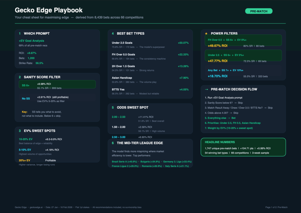 This prompt generates 69% of all pre-match recommendations and returns +9.87% ROI across 1,200 bets. It covers goal markets and Asian Handicap — the bet types the model handles best.