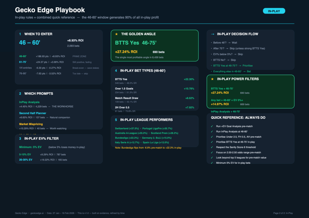 But it’s still a snapshot. Some of the smaller samples (individual Sanity Scores of 9 or 10, specialist prompts with 29 bets, specific league-and-bet-type combinations) are directional signals, not confirmed edges. The headline findings — the Sanity Score threshold, the 46-60′ window, the BTTS Yes in-play angle, the bet type rankings — come from hundreds or thousands of bets and carry real statistical weight.